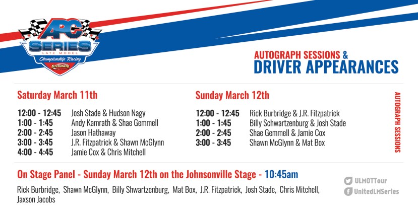 Race fans will have the chance to meet some of the stars of the APC Series for scheduled autograph sessions that will run throughout the weekend featuring Josh Stade, Hudson Nagy, Andy Kamrath, Shae Gemmell, Jason Hathaway, J.R. Fitzpatrick, Shawn McGlynn, Chris Mitchell, Rick Burbridge, Billy Schwartzenburg, Jamie Cox, and Mat Box. Also do not miss the series panel on the Johnsonville stage, taking place Sunday morning at 10:45am.