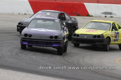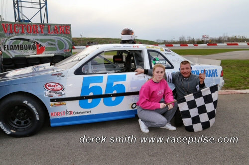 The final race of the night was for the Pro Four Modifieds. Gillian Hils and Linc Erison were on the pole. Hils pulled away and and started to build a sizeable lead. The “Rockwood Rocket” Mike Westwood got by Erison on lap four and was closely followed by Dan Nanticoke. By half way Westwood and Nanticoke were closing the gap and gaining quick and on lap 11Westwood and Nanticoke got by Hils putting her back to third. That was how they ended up Westwood followed by Dan Nanticoke and Gillian Hils.