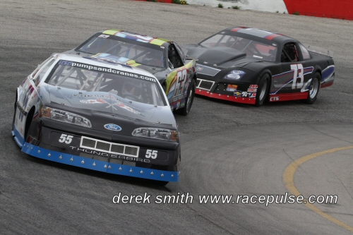 The final race before intermission was for the Pro Four Modifieds. Aaron Turkey and Dan Nanticoke were up front for the first 15 lap feature. Dan Nanticoke was the leader and the 91 of Mike Westwood was close behind. The two raced bumper to bumper for several laps. A caution came out and Westwood was put back two spots for jumping the initial start. Nanticoke broke awat and won the feature followed by Brian Nanticoke and Westwood.