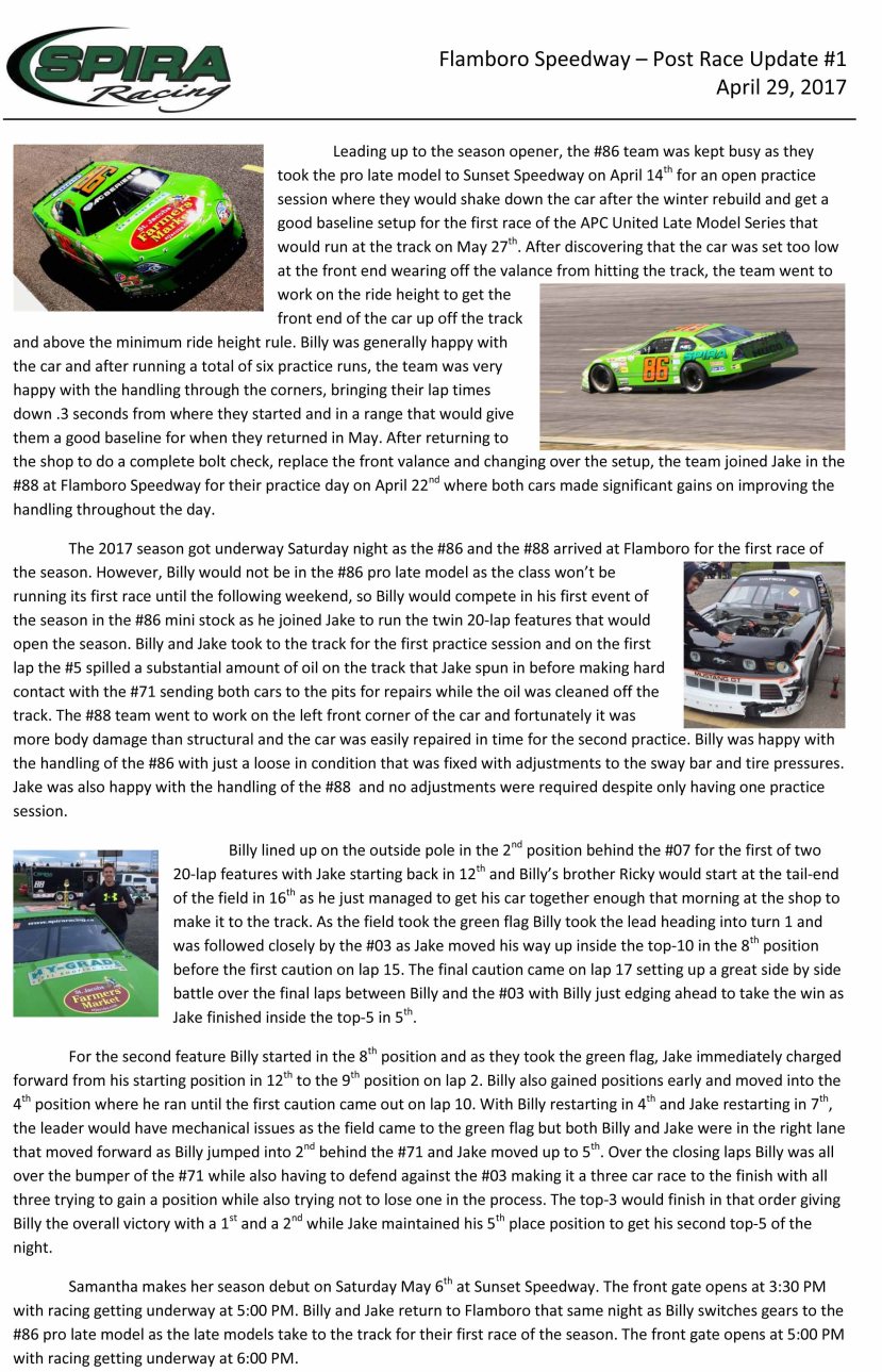 Flamboro Speedway Flamboro Speedway – Post Race Update #1 April 29, 2017 By officialrelease01 on May 2, 2017 • ( Leave a comment ) Share this: Click to share on X (Opens in new window) X Click to share on Facebook (Opens in new window) Facebook Like Loading... Related Categories: Flamboro Speedway, Press Release Tagged as: billy schwartzenburg, flamboro speedway, jake watson, Press Release, spira racing