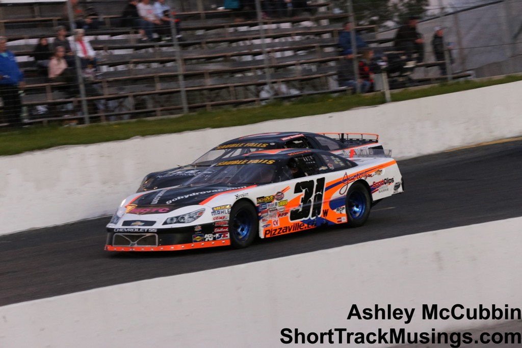 Off the drop of the green flag, Spencer-Walt put the No. 31 Gohydrovac.ca, Jim Wilson Chevrolet, Frame Shop Huntsville, Auto Trim Design, Heidis RV, HOTC, Greensteelroof.ca, Crowe Bros, RCP Dyno and Tuning, Speedy Auto Machine, Bent by Kent, SportsClip, Pizzaville Alcona, Speedy Glass Orilla, and Orser Technical Services Late Model out front ahead of Holdaway Motorsports teammates Bentley and Holdaway.