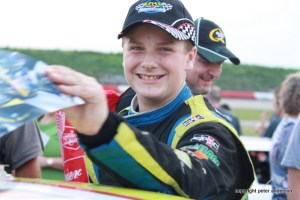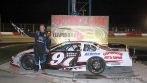 By Randy Spencer (Flamboro Speedway PR) – One of the highlights on the calendar of fans and drivers alike at Bennett Chevrolet Flamboro Speedway is always Meet the Drivers Night. It is exciting for the fans to get up close with the cars and the favorite drivers on track. And this year was once again an exciting night for all with almost 70 cars on track. The drivers always look forward to this night as well, it gives them a chance to sign autographs, take pictures with their fans and hand out candy and other great things for kids of all ages. A big thanks to all those drivers that participated and handed out prizes and goodies to all. A big thanks to Rich Schwartzenberg for the gift “baskets” and Matt Fraser and Matt Young for the great scooter that they put up for a lucky fan. And it was an even better night for a couple of graduates of the Mini Stock division as 13 year old Carson Nagy won his first ever feature in Super Stocks and Blair Wickett won his first career Late Model feature race win. Lots of racing as our five regular divisions as well as a visit by the Lucas Oil Can Am Midgets.