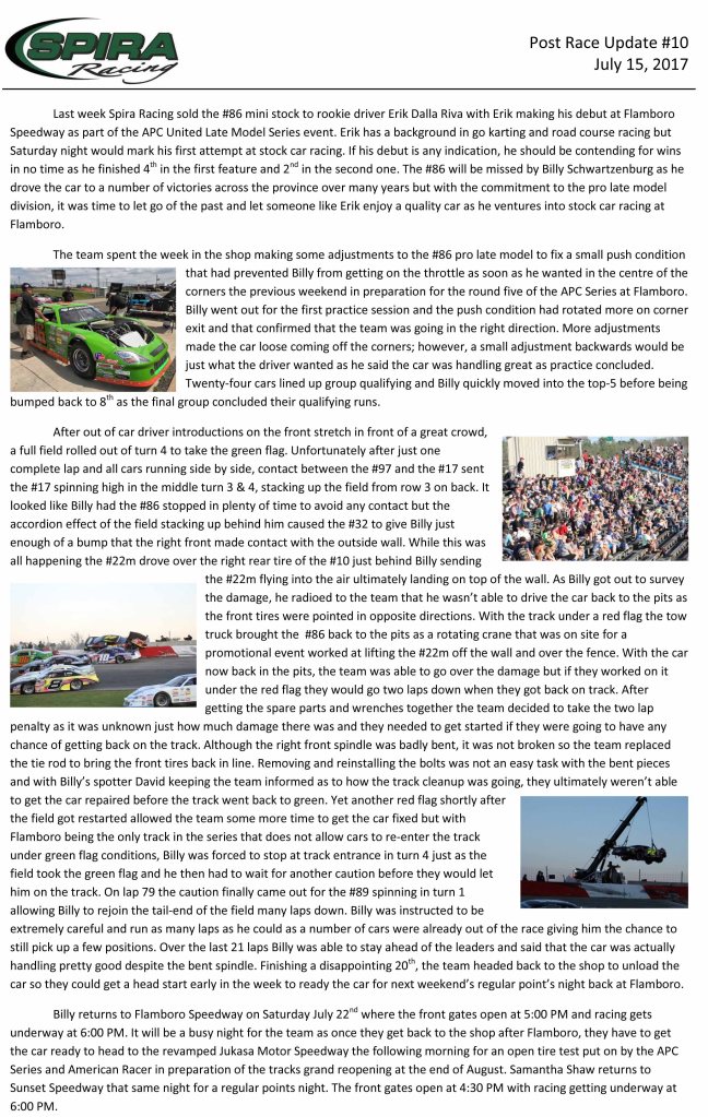 Flamboro Speedway Spira Racing – Post Race Update #10 – July 15, 2017 By officialrelease01 on July 19, 2017 • ( Leave a comment ) Share this: Click to share on X (Opens in new window) X Click to share on Facebook (Opens in new window) Facebook Like Loading... Related Categories: Flamboro Speedway, Press Release, United Late Models of Ontario Tour Tagged as: apc auto parts united late models of ontario tour, billy schwartzenburg, flamboro speedway, Press Release, spira racing