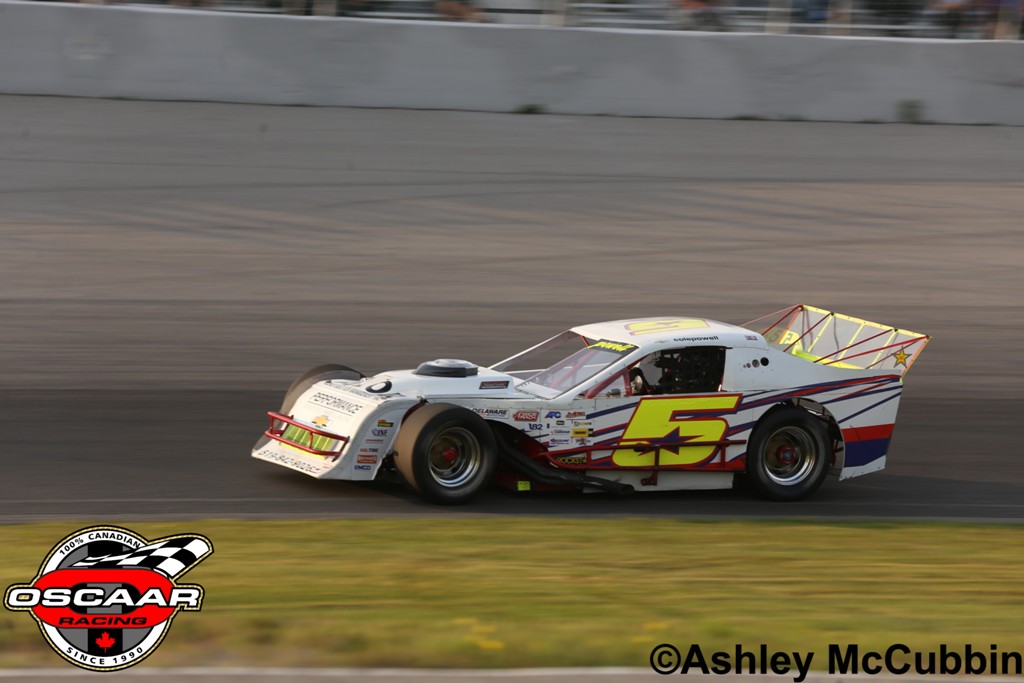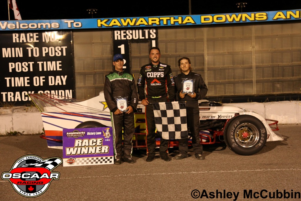 In an epic three-way battle for the top spot, it’d be Cole Powell coming out on top for the OSCAAR Modified feature victory at Kawartha Speedway on Friday night.