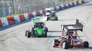 OSCAAR Pro Midgets were next for two ten lap heats. J.R. Fitzpatrick was in Ted Greenwood’s new car and sat on pole along side Brody Rickwood. Fitpatrick led the first lap but Jordan Hanna had a very fast car all night and shot past Fitzpatrick in turn one on lap four. Hanna would extend the lead to half a straightaway as the checkers fell on him on lap ten. The second heat had Steve Belfry and Gary Triska on the pole. Shawn Paul who started fifth was the leader first time past and would build a big lead. He would lead the rest of the way for the win followed by Craig Pitchell and Brent Kemps.