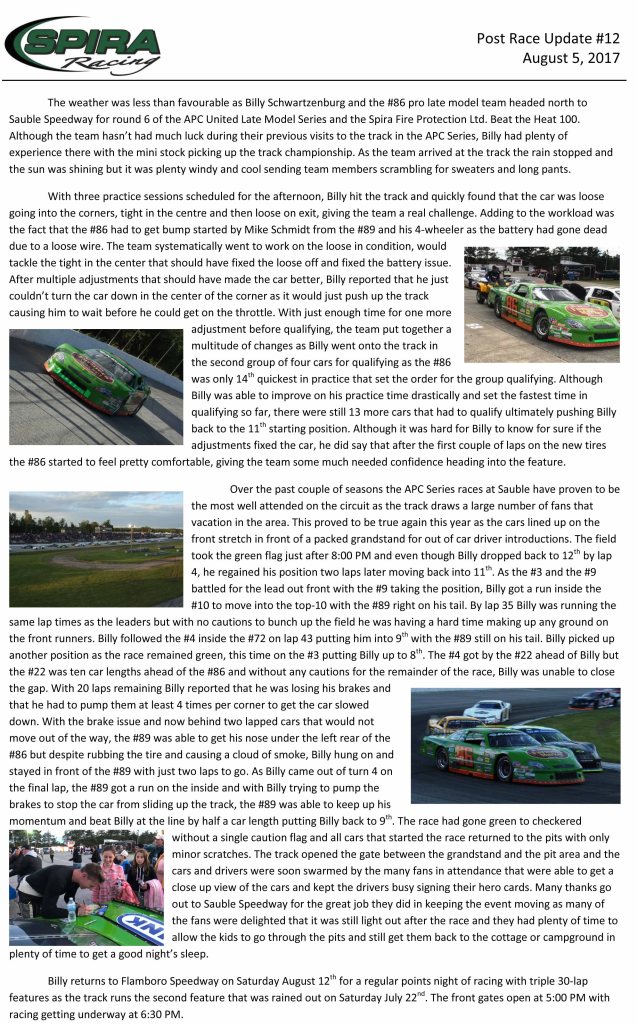 Press Release Spira Racing – Post Race Update #12 – August 5, 2017 By officialrelease01 on August 8, 2017 • ( Leave a comment ) Share this: Share on X (Opens in new window) X Share on Facebook (Opens in new window) Facebook Like Loading... Related Categories: Press Release, Sauble Speedway, United Late Models of Ontario Tour Tagged as: apc auto parts united late models of ontario tour, billy schwartzenburg, Press Release, Sauble Speedway, spira racing