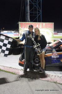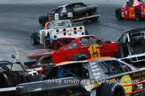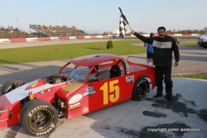 The final race of the night was the fourth and final feature for the Pro Four Modifieds. Linc Erison and Brian Nanticoke were out front but Mark Lucas was the leader first time past. A caution as Dave Hodgkinson was around in four on lap six. The field was back to even but Lucas was still the leader on the restart. He would break away but the Nanticoke brothers weren’t too far out of sight. But as the checkers flew, Lucas made it three for four on the night.