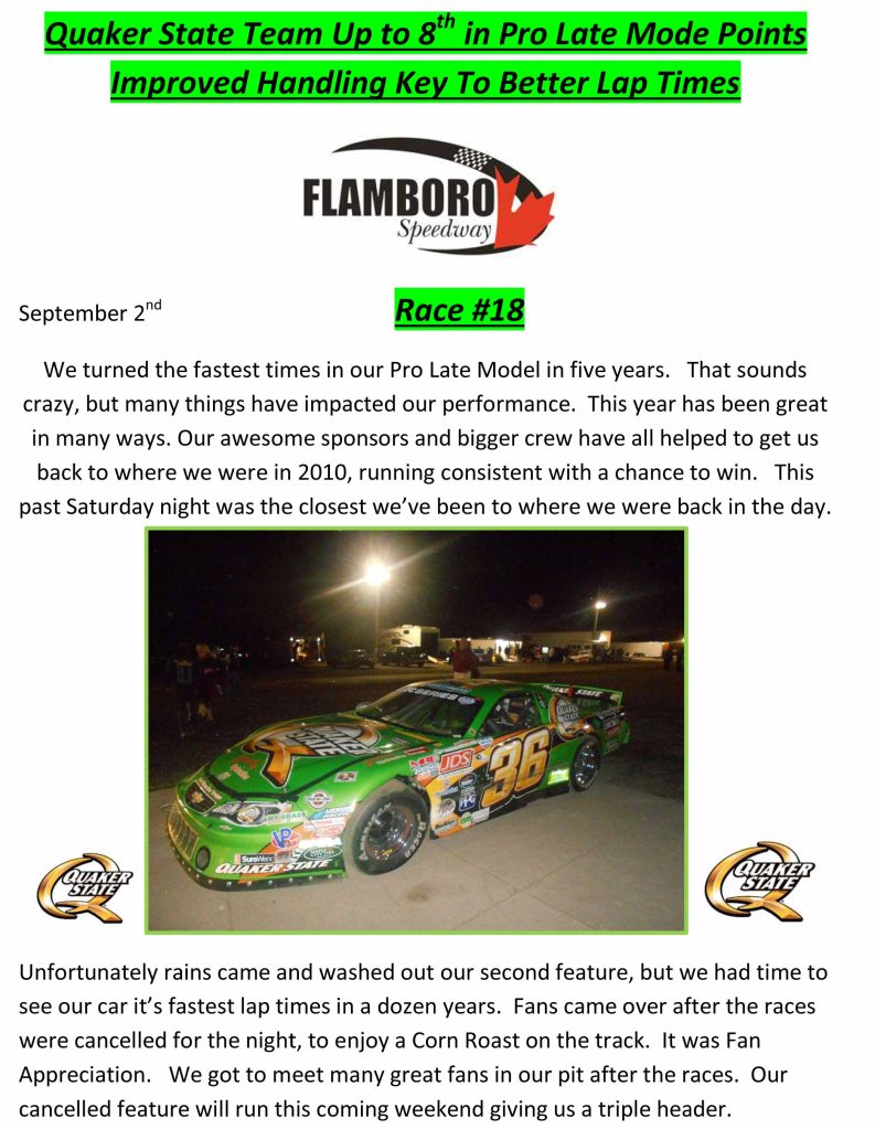 Flamboro Speedway Quaker State Team Up to Eighth in Pro Late Model Points By officialrelease01 on September 7, 2017 • ( Leave a comment ) Share this: Click to share on X (Opens in new window) X Click to share on Facebook (Opens in new window) Facebook Like Loading... Related Categories: Flamboro Speedway, Press Release Tagged as: flamboro speedway, gary elliott, gary elliott motorsports, Press Release