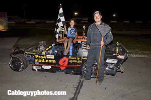Next would be the Mini Stocks. Jonathan Ayrton and Kyle Istead were pole. Ayrton led lap one but Shawn Taylor who started sixth would be the new leader the second time past. Taylor got out to a big lead with a real battle for second through fourth between Matt Young, Russ Aicken and Erik Dalla Riva. Aicken would get past and was second but didn’t have enough to overtake Taylor. As the checkers flew it was Taylor followed by Aicken and Young. Congratulations to Russ Aicken on his third straight points title. He tied Mike Holmes in 2013 so three wins and a tie over four years for Russ.