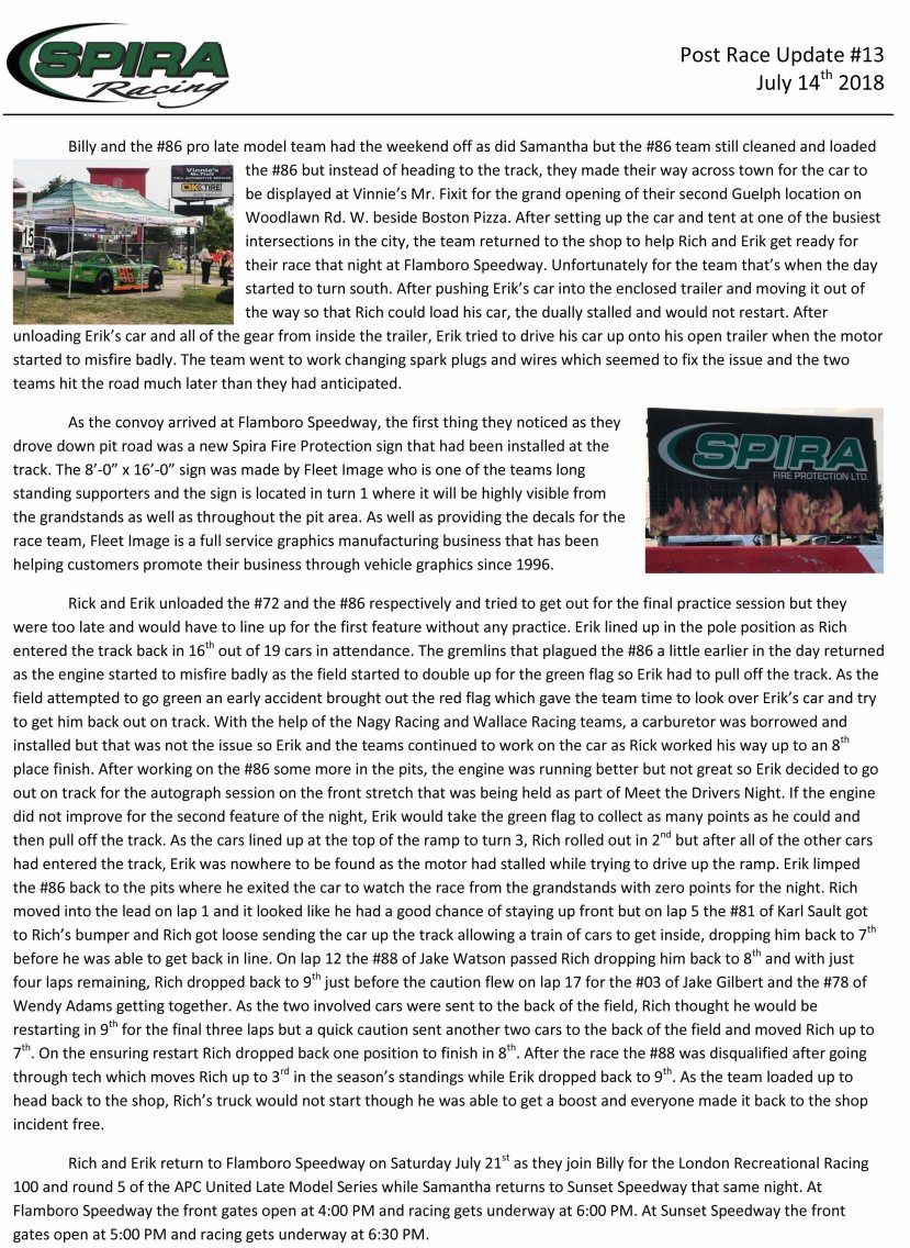Flamboro Speedway Spira Racing – Post Race Update #13 By officialrelease01 on July 20, 2018 • ( Leave a comment ) Share this: Click to share on X (Opens in new window) X Click to share on Facebook (Opens in new window) Facebook Like Loading... Related Categories: Flamboro Speedway, Press Release Tagged as: billy schwartzenburg, erik dalla riva, flamboro speedway, Press Release, rich schwartzenburg, spira racing