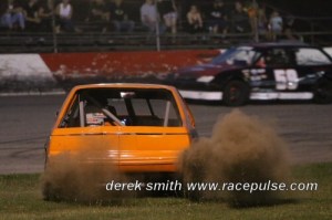 Before thrilling the fans at intermission with a drift show, Dylan Sharpe showed that he is quite the racer as well, driving to victory lane in the first Pure Stock feature of the night. Travis Hofsetetter crossed the finish line in second, but disqualified post-race for being underweight. Courtney Scott would get credited with second, followed by Phil Givens, Dale Lucas, Ryan Hillar, Jared Bodnar, Mark Thorne, Matt Fraser, Andy Wheller, Bill Rutherford, Kris Sharpen and Peckham.