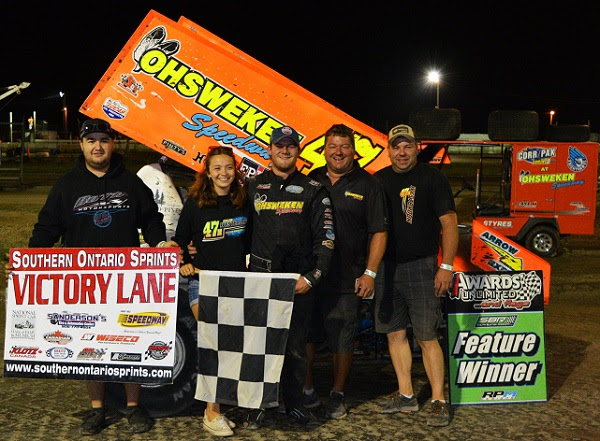 MERLIN, Ontario (August 18, 2018) – Dylan Westbrook continued his mastery of South Buxton Raceway on Saturday night, as the defending Southern Ontario Sprints champion took his fourth consecutive win at the unique D-shaped 1/3 mile track.