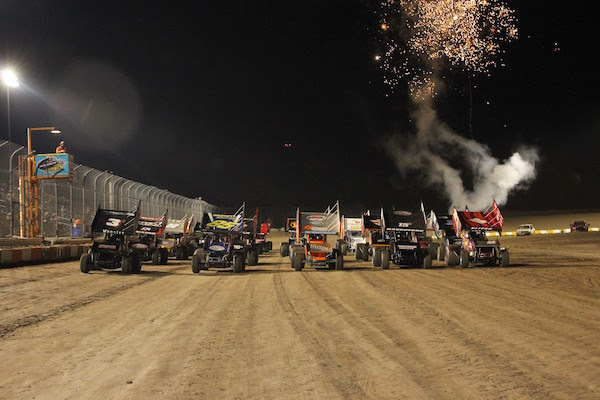 The 2017 Canadian Sprint Car Nationals field assembled five-wide prior to the start of the 35-lap A-Feature. (Photo by Dale Calnan/Image Factor Media).