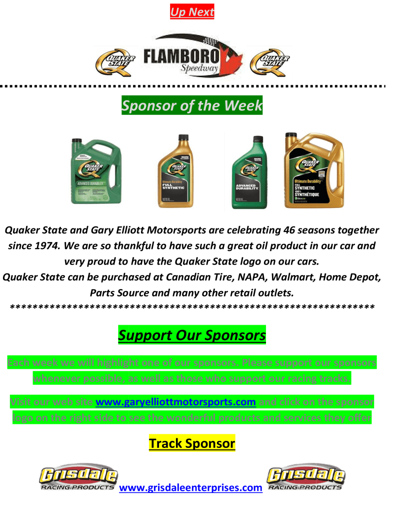 Flamboro Speedway Quaker State Team Finishes Top 10 Twin 30’s Opening Night Flamboro Speedway By officialrelease01 on May 10, 2019 • ( Leave a comment ) Share this: Click to share on X (Opens in new window) X Click to share on Facebook (Opens in new window) Facebook Like Loading... Related Categories: Flamboro Speedway, Press Release Tagged as: flamboro speedway, gary elliott, gary elliott motorsports, Press Release