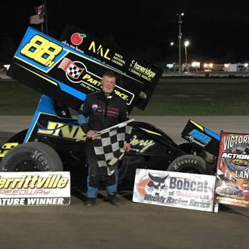 Josh Hansen celebrates his season-opening win with the Action Sprint Tour at Merrittville Speedway on Monday night. (Action Sprint Tour photo).