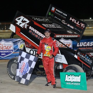 Dylan Westbrook celebrated his 23rd career 360 Sprint Car victory at Ohsweken Speedway on Friday night. (Photo by Dale Calnan/Image Factor Media).