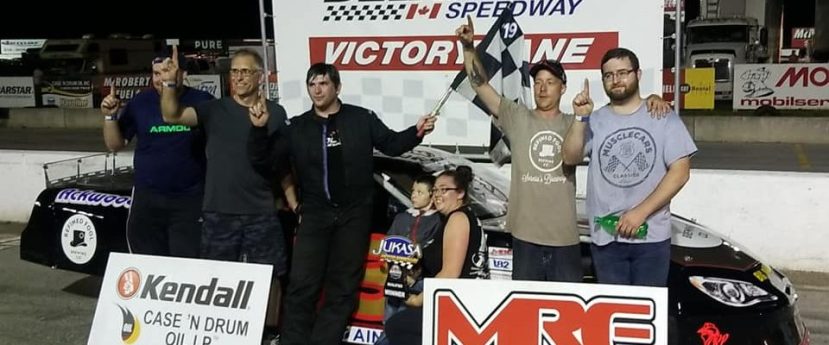 Final Feature of the evening was the Jukasa Speedway Qualifier for Late Models, for their huge Canadian Short Track Nationals on Labour Day Weekend. A win in this feature guarantees a spot in the big $75,000 to win race. 18 Case N’ Drum Oil Late Models Presented by MRE Late Models came down for the green, with Rookie of the Year Candidate Jeremy Taggart in his quick #4 leading the first lap. By lap #2, Jaden Chapman in his #13, fresh from a strong run the first feature, powered into the lead. After a caution, the top 5 were Chapman in his #13, Jason Lidster #11 in a strong run, another strong run by the 28L of Kris Lawrence, Adriaensen in his #55 and Jo Lawrence in his #78. On lap number 7, fast running Kris Lawrence heads to the pits, through for the night. Contact on the front straight coming out of turn number 4, took out the #4 of Jeremy Taggart, #31 of Chris Hebert and the #22 of rookie Marshall Shrenk and were all through for the night. Shrenk definitely got the worst of it as his car had to be cradled back to the pits. Lawrence moved into 2nd on lap number 14 and heads for the leader Jaden Chapman. With 10 laps to go Lawrence got to within four car lengths of the leader, but seemed to be stalled at that point. Going into the 24th lap, Jaden encountered heavy traffic which allowed Lawrence to pull with 1 car length. For the final laps Jaden Chapman held off everything Jo Lawrence had to give and roared across the finish line for an extremely popular win, his first in a Late Model. This guaranteed Chapman a starting spot in the Canadian Short Track Nationals, at Jukasa Speedway. Rounding out the top five, was a superb, strong run by Jason Lidster in #11 in 3rd, another good run by Ray Morneau #03 in 4th and Jake Sheridan in his #52 in 5th