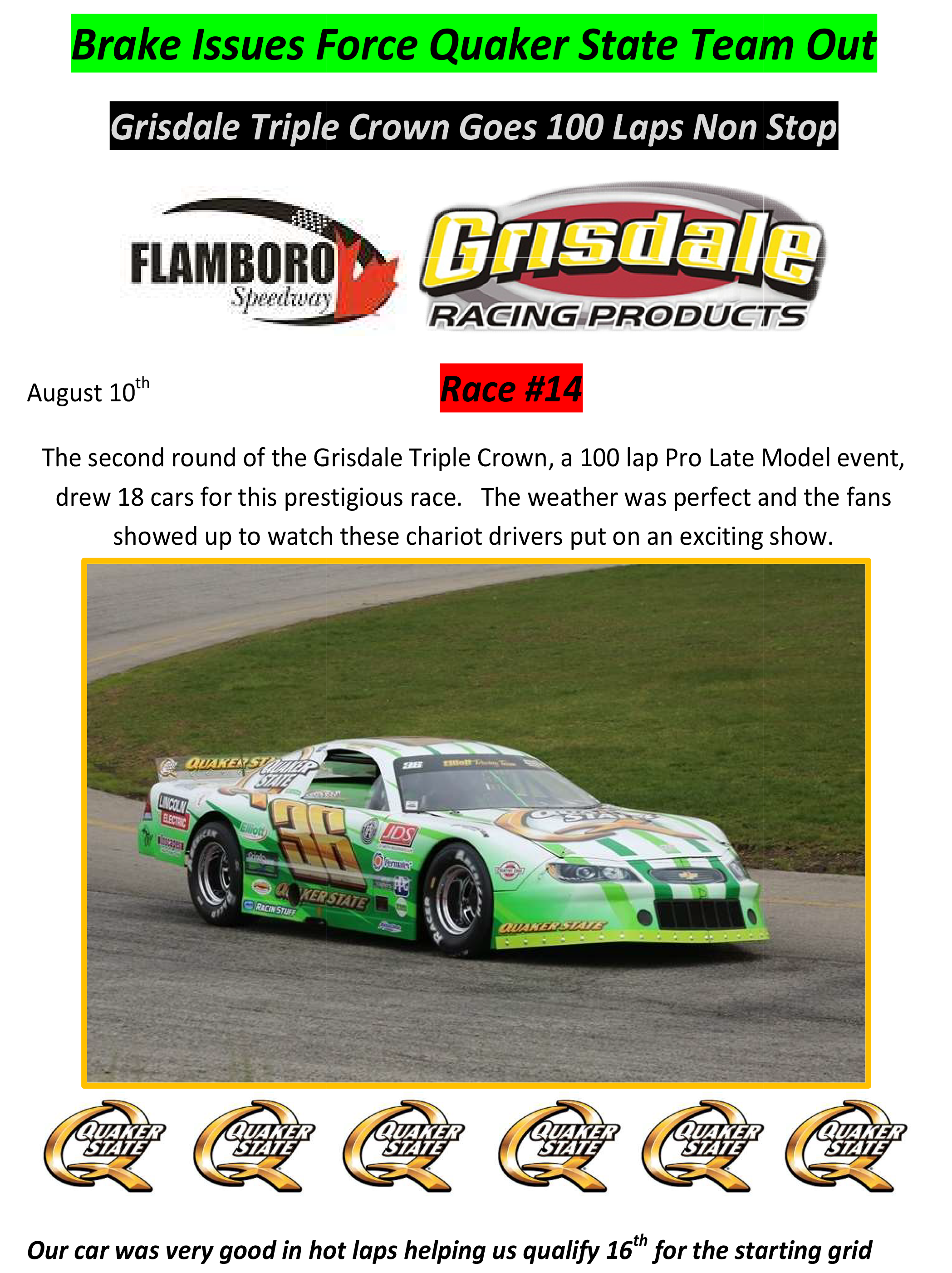 Flamboro Speedway Brake Issues Force Quaker State Team Out By officialrelease01 on August 14, 2019 • ( Leave a comment ) Share this: Click to share on X (Opens in new window) X Click to share on Facebook (Opens in new window) Facebook Like Loading... Related Categories: Flamboro Speedway, Press Release Tagged as: flamboro speedway, gary elliott, gary elliott motorsports, grisdale triple crown, Press Release