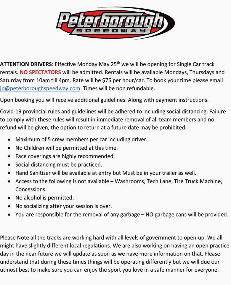 Peterborough Speedway Peterborough Speedway COVID-19 Update – May 18, 2019 By officialrelease01 on May 18, 2020 • ( Leave a comment ) Share this: Click to share on X (Opens in new window) X Click to share on Facebook (Opens in new window) Facebook Like Loading... Related Categories: Peterborough Speedway, Press Release Tagged as: covid-19, peterborough speedway, Press Release