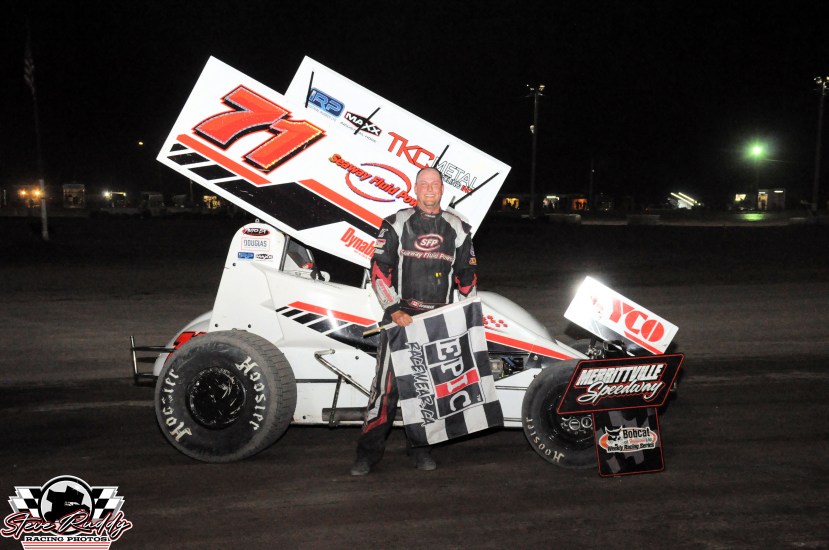 The win was Bowman’s first in a Crate Sprint Car at Merrittville, and his second AST victory. Dykstra and Bardier took podium finishes, followed by Steven Beckett and row seven starter Allan Downey. The top five finish was a reward for Downey and his crew who spent the day building a car following a grinding crash in weekly competition at Ohsweken on Friday night. Heat race wins went to Bardier, Bowman, and Seth Roy, another driver who had to thrash due to crash damage the previous night.
